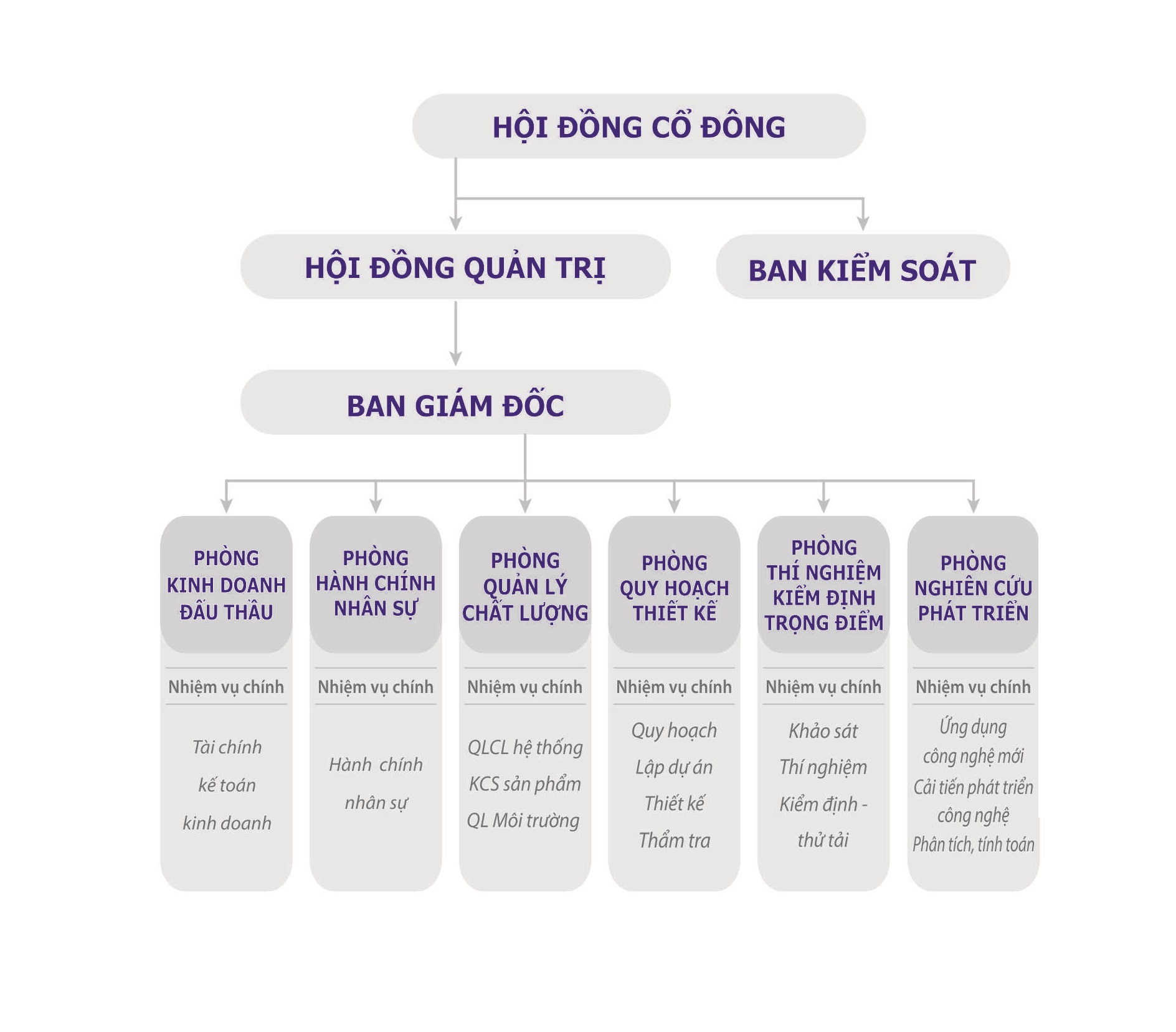 Về cơ cấu tổ chức: Gồm Ban Giám đốc và 05 phòng ban chức năng: Phòng Kinh doanh  Đấu thầu; Phòng Hành chính Tổng hợp; Phòng Quản lý Chất lượng; Phòng Nghiên cứu  Phát triển; Phòng Quy hoạch Thiết kế, Phòng Thí nghiệm Kiểm định trọng điểm đường bộ, môi trường và an toàn giao thông và một số Phòng Thí nghiệm hiện trường tại các dự án.